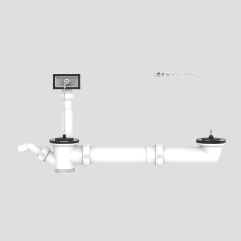 Ab- und Überlaufgarnitur G1 1/2 x max. 440mm beidsetig mit Stopfen und Kugelkette aus Kunststoff, mit exzentrischem Abgang, Ablauf aus Edelstahl und Geräteanschluss, für Doppelspülen, Verpackung im Folienbeutel