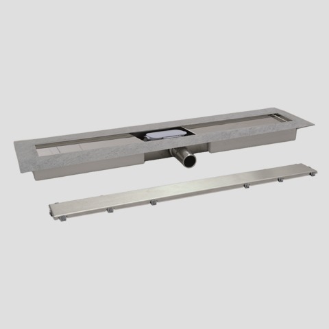 Duschrinne ES 50, rahmenlos, Abgang waagerecht, Höhe 62mm Länge: 750mm für Nassbau, bestehend aus Duschrinne Edelstahl Breite 50mm, geringste Einbauhöhe 62mm, Geruchverschlusshöhe 30mm (nicht normgerecht), Ablaufleistung 0, 5L/s nach DIN EN 1253, inkl. Befliesungsauflage aus Edelstahl aufgeklebte Dichtmanschette, Fliesenlehre und MS-Polymer-Kleber, Verpackung im Karton