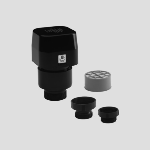 ventilair active mit Gewindeanschlüssen für den zugänglichen Außenbereich, zur Filterung von entstehenden Gasen bei Hauskläranlagen, Hebeanlagen, vorhandenen offenen Entlüftungen, z. B. Einzelöltanks, Sickergruben usw. , mit Aktivkohlefilter überwacht durch die TÜV Rheinland LGA Products GmbH, Luftdurchströmmenge bei 250 PA = 3, 33L/s = 12 m3h, Frostbeständigkeit bis -20 Gr C in Anlehnung an die DIN EN 12380, Haube aus UV-lichtbeständigem Kunststoff, mit Außengewinde G2 zum Einsatz im Druckbereich bis 1 bar und zwei zusätzlichen Reduzierstücken, Außengewinde G1 1/2 und G1 1/4