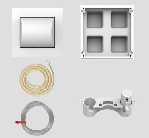 WC-Betätigung 1-Mengenspülung, pneumatisch für UP-Spülkästen kleine Revisionsöffnung, CC-121-S-FO-2V-2C, CC-122-S-UO-2V-2C, CC-150-S-UO-2V-2C, CC-150-S-FO-2V-2C und CC-120-S-FO-2V-2C Kunststoff, für Nass- und Trockenbau, B/H 120 x 114mm, Höhe über Fliesen 31mm, minimale Einbautiefe Vorderkante Wandbelag/Hinterkante Rohbaukasten 65mm, parallel zur pneumatischen 1V WC-Fernauslösung ist die Spülauslösung am Spülkasten mit den Tasten Serie 700 als 2V oder Start-/Stopp bzw. Einmalspülung möglich, Taste 706 Glas/elektronisch ist ausgeschlossen, bestehend aus: WC-Handdrücker 1V mit pneumati-scher Drückereinheit, Pneumatikhubeinheit 1V, Hohlraumdose und Bauschutz, Pneumatikschlauch 1V-2, 35 m, Leerrohrset mit Zugschnur 1, 7 m, Montageanleitung und Befestigungsmaterial, Verpackung im Karton