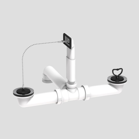Ab- und Überlaufgarnitur G1 1/2 x max. 380mm mit Stopfen mit Kunststoffbügel und Stopfen mit Kugelkette aus Kunststoff, mit zentrischem Abgang, Raumsparabgang und Ablauf aus Edelstahl, für reversible Doppelspülen, Verpackung im Folienbeutel