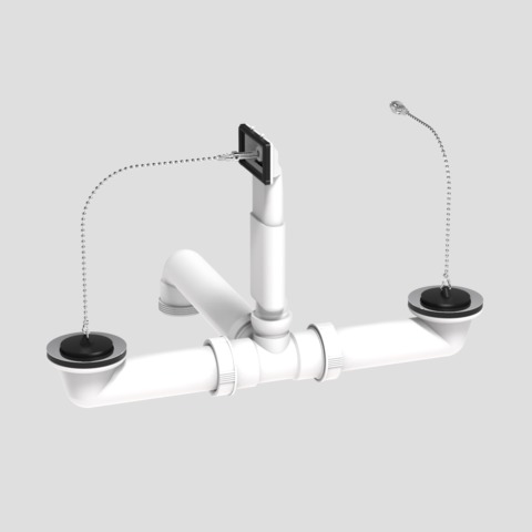 Ab- und Überlaufgarnitur G1 1/2 x max. 380mm beidseitig mit Stopfen und Kugelkette aus Kunststoff, mit zentrischem Abgang, Raumsparabgang und Ablauf aus Edelstahl, für reversible Doppelspülen, Verpackung im Folienbeutel