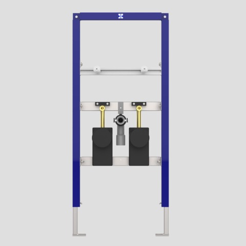 Waschtisch-Element INEO für Einlocharmaturen, mit 2 UP- Wasserzählerstrecken mit UP-Ventil inkl. T-Stück für Eckventil und Etagenverteilung H/B/T: 985/525/90mm, selbsttragende, pulverbeschichtete Stahlrahmenkonstruktion, zur Trockenverkleidung, Einbau vor Massivwand, in Leichtbau-Ständerwand u. v. m. , 4 Befestigungspunkte, komplett vormontiert, inkl. Füße und Befestigungsmaterial, universell einsetzbar für Waschtische und Handwaschbecken, Verstellbereich Füße von Rohfußboden bis OKFFB: 0-200mm, Tiefenverstellung Vorderkante Element: 135-205mm (bei Verwendung von Wandhaltern Art. -Nr. 17. 257. 00. . T000), mit zwei Gewindebolzen M10 inklusive Bauschutz und Waschtischbefestigung, mit Universalablaufbogen DN 50 (d: 50)/DN 40 (d: 40) inklusive Gummimanschette für Geruchverschluss-Ablaufstutzen DN 40 (d: 40)/DN 32 (d: 32), Bauschutz und schallgedämmter Ablaufschelle (inklusive zwei vormontierter, schallgedämmter UP-Wasserzählerkombinationen aus Rotguß mit UP-Ventil R3/4, mit UP-Einrohranschlussstücken für WZ-Messkapsel Koax G2B), mit T-Stück für Eckventil R1/2, mit Etagenverteilung Abgang nach oben R3/4, mit zweiteiliger Isolierung und integrierter Einputzhilfe, inkl. Befestigungs- und Anschlussmaterial, Verpackung im Karton