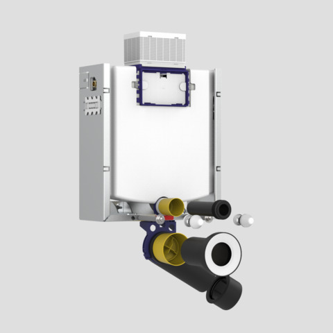 WC-Montageelement FronTop 820 für Wand-WC mit Befestigungsabstand 180/230mm, mit kleiner Revisionsöffnung, Betätigung von vorn/oben, Bauhöhe: 820mm, zum Ein- oder Vormauern vor Massivwand, bestehend aus einem verzinkten u-förmigen Element mit 4 Befestigungspunkten, WC-Befestigungsmaterial M12, mit vormontiertem schwitzwasserisolierten SANIT UP-Spülkasten (CC-122-S-UO-2V-2C) mit 2-Mengenspülung (6/3L), Übertragung der Tastenfunktion über flexible Kabeltechnik zur Ablaufgarnitur, Verbindung zur Betätigungsplatte über Dreh-Klick-Verbindung, SANIT Füllventil Armaturengruppe I, Eckventil-Anschlussset R 1/2, Befestigungsschelle für Ablaufbogen 4-fach verstellbar, PE-WC-Anschlussbogen 90Gr DN 90(d: 90) mit Übergangsmuffe DN 90 (d: 90)/DN 100(d: 110) und Bauschutz, WC-Anschlussgarnitur DN 90 (d: 90), Bauschutzkasten für Revisionsöffnung kürzbar, flexibler Schlauch zum Füllventil von Hand verschraubbar, Befestigungsmaterial inklusive, ohne Fußstützen, ohne Betätigungsplatte, Verpackung im Karton UP-Spülkasten geprüft nach DIN EN 14055, Armaturengruppe I